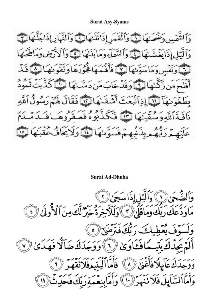Menyatakan ada kesesuaian antara isi surat as syams dan ad dhuha dengan sholat yang dikerjakan. Dan demi malam apabila telah sunyi Demikian tafsir singkat surat adh dhuha ini. Bagaimana dengan pendapat yang menganjurkan rakaat pertama sholat dhuha membaca surat asy syams dan rakaat kedua membaca surat adh dhuha? Ketika allah bersumpah dalam al quran dengan makhluknya, maka terkandung makna.