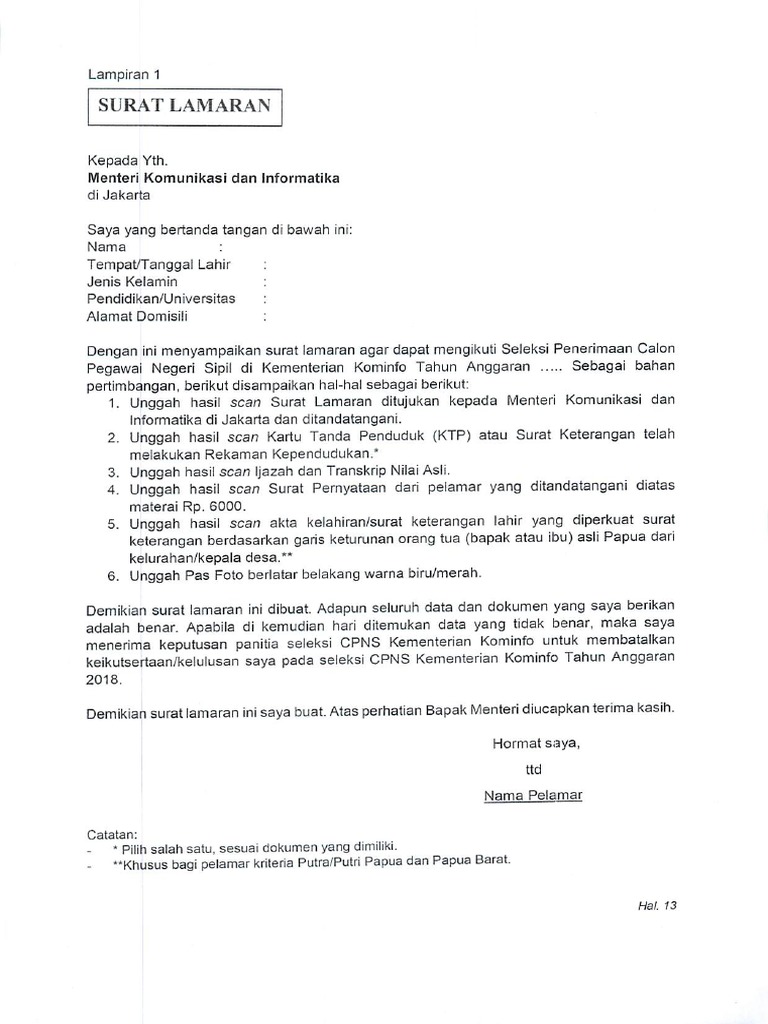 Bagaimana contoh surat lamaran cpns kemenkumham, kemendikbud, kementan, kemenkes, anri, kabupaten/kota, dan formasi cpns 2019 lainnya? Berikut contoh surat lamaran cpns pemrov jateng. Berkas cpns contoh surat lamaran cpns 2019 cpns 019 cpns kemenag cpns kemendikbud cpns kemenkumham formasi cpns jateng 2019. 6000 ditujukan kepada menteri hukum dan ham ri di jakarta dan ditandatangani dengan pena bertinta hitam. Surat pernyataan dan surat pernyataan ini merupakan salah satu syarat yang harus di sertakan oleh peserta seleksi cpns kemenkumham.